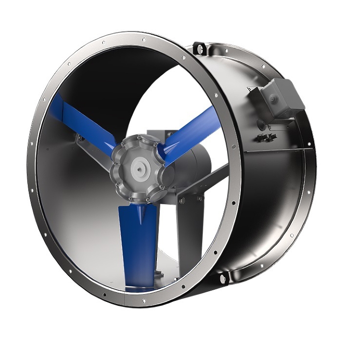 осевой вентилятор, максимальный расход воздуха 18 530 куб. м/ч, частота вращения 3 000 1/мин, максимальный располагаемый напор 552 Па, присоединительный размер 500 мм, материал корпуса: сталь, монтаж: в воздуховод